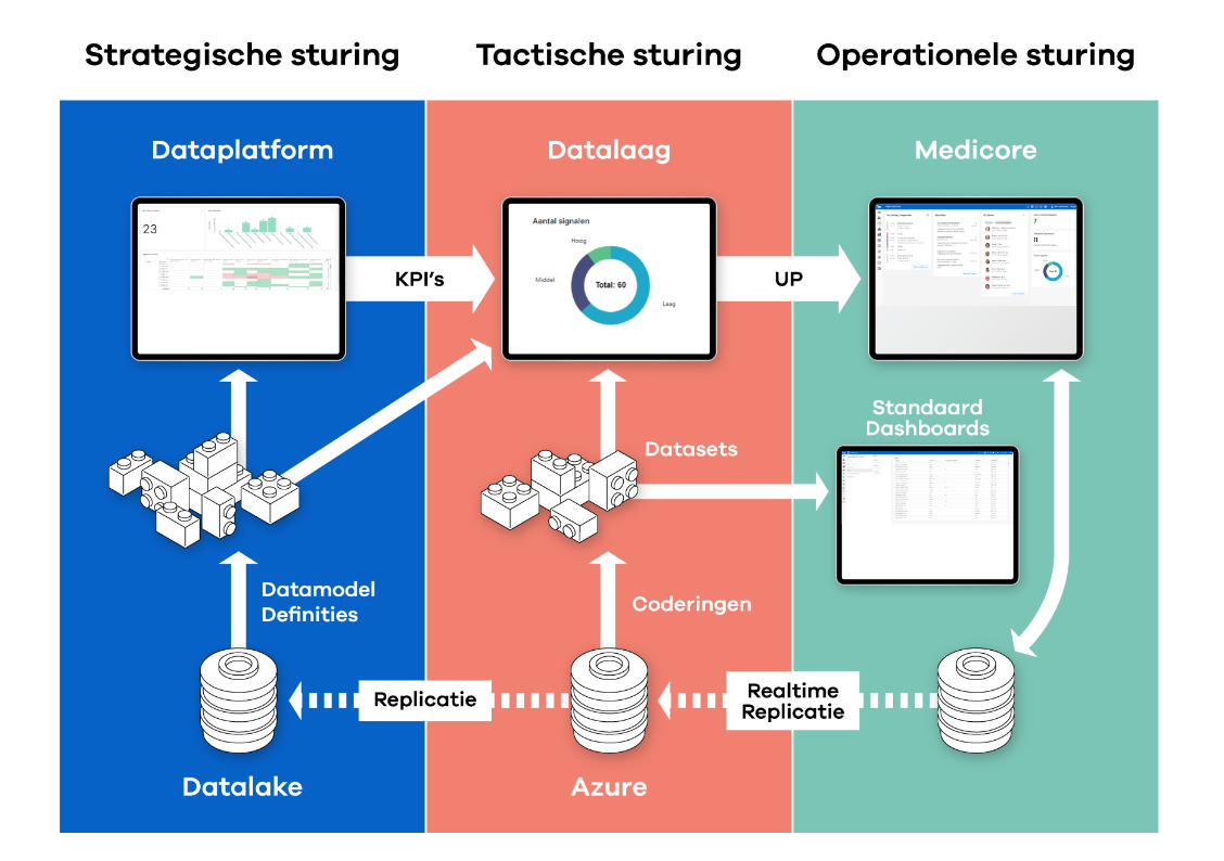 Medicore UP brengt data uit meerdere bronnen samen in één modern platform. Dit verbetert de datakwaliteit en vermindert beheerlasten, omdat informatie direct bij de bron kan worden aangepast en automatisch terugvloeit naar het bronsysteem. Zo ondersteunt Medicore UP de realisatie van strategische doelen met betrouwbare data en slimme inzichten.