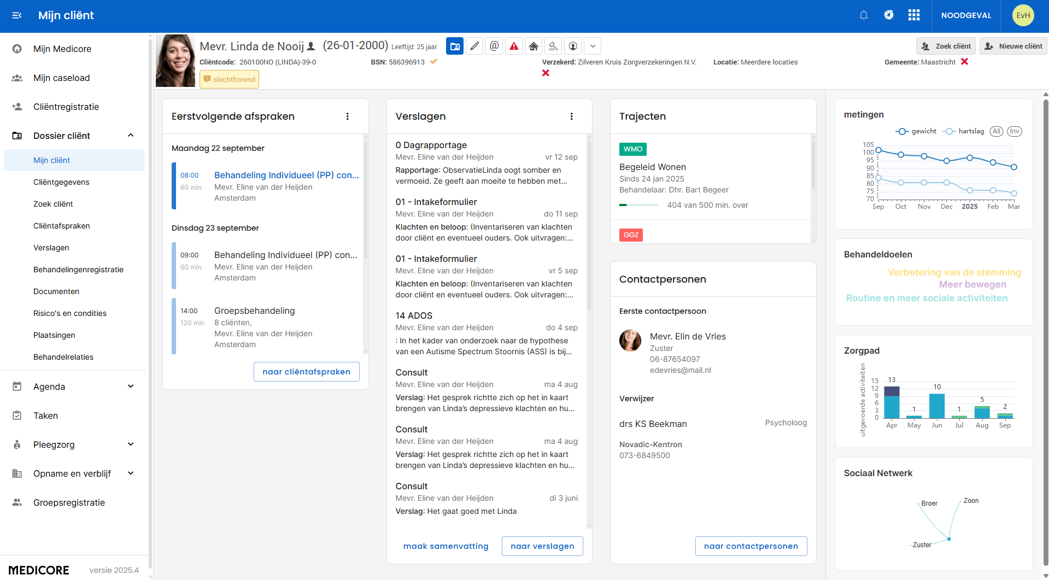 Zodra de werkdag begint, krijgen zorgverleners in Mijn Medicore direct een overzichtelijk dashboard te zien met alle relevante informatie voor die dag. Aan de zijkant van Mijn Medicore staan meerdere actiegerichte UPs. Zoals een overzicht van niet-verwerkte afspraken, taken om actie te ondernemen op een aflopende toewijzingen en andere zelf in te richten signalen over de caseload. Mijn Cliënt is de cliëntsamenvatting in Medicore, waar zorgverleners alle informatie over een cliënt in één duidelijk overzicht vinden. Hier staan de eerstvolgende afspraak, taken rondom de cliënt, en contactpersonen overzichtelijk bij elkaar. Los daarvan is er ook de mogelijkheid tot een selfservicefunctie. Met de selfservicefunctie van UP creëer je eenvoudig je eigen inzichten, op maat voor jouw organisatie.