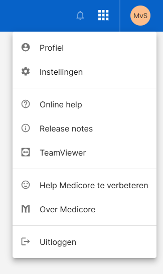 De verschillende functies hebben een nieuwe plek en soms een nieuwe naam gekregen. Meer hierover lees je in de volledige release notes. Het profiel is voortaan beschikbaar voor alle gebruikers en te openen via het gebruikersmenu rechtsboven. Daarmee is het Zorgverlenersportaal volledig geïntegreerd in Medicore.